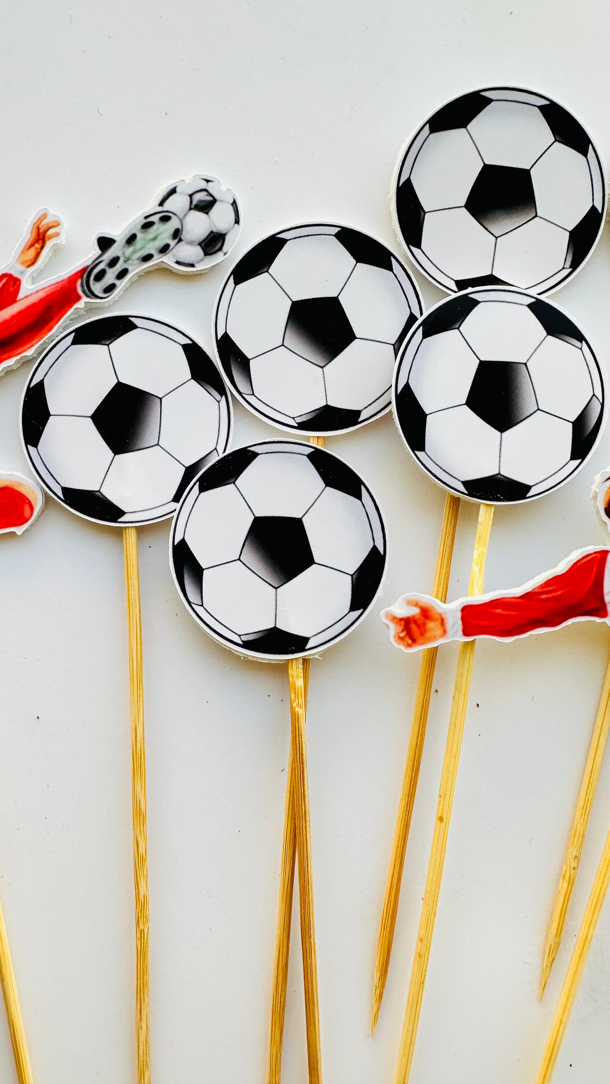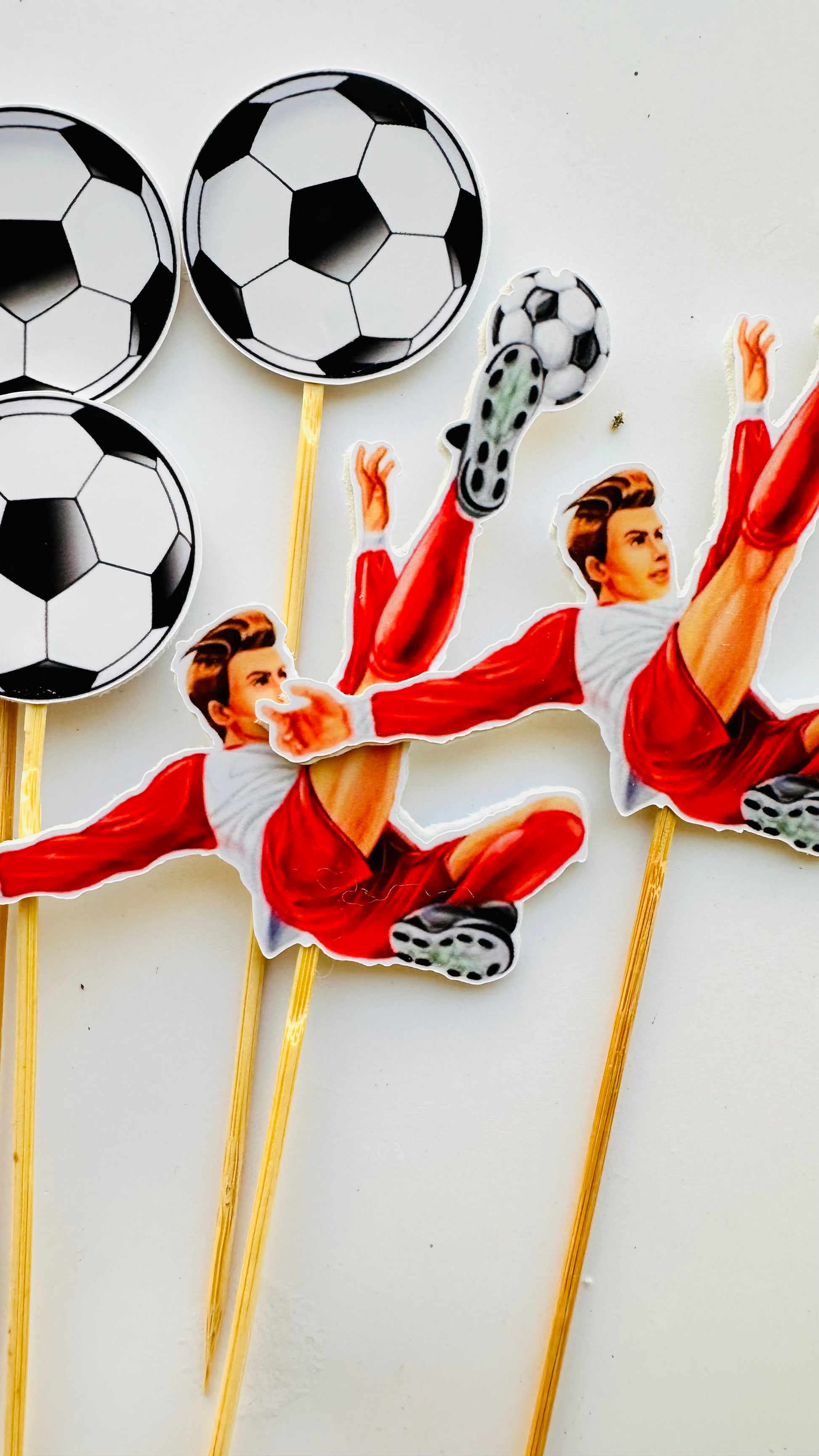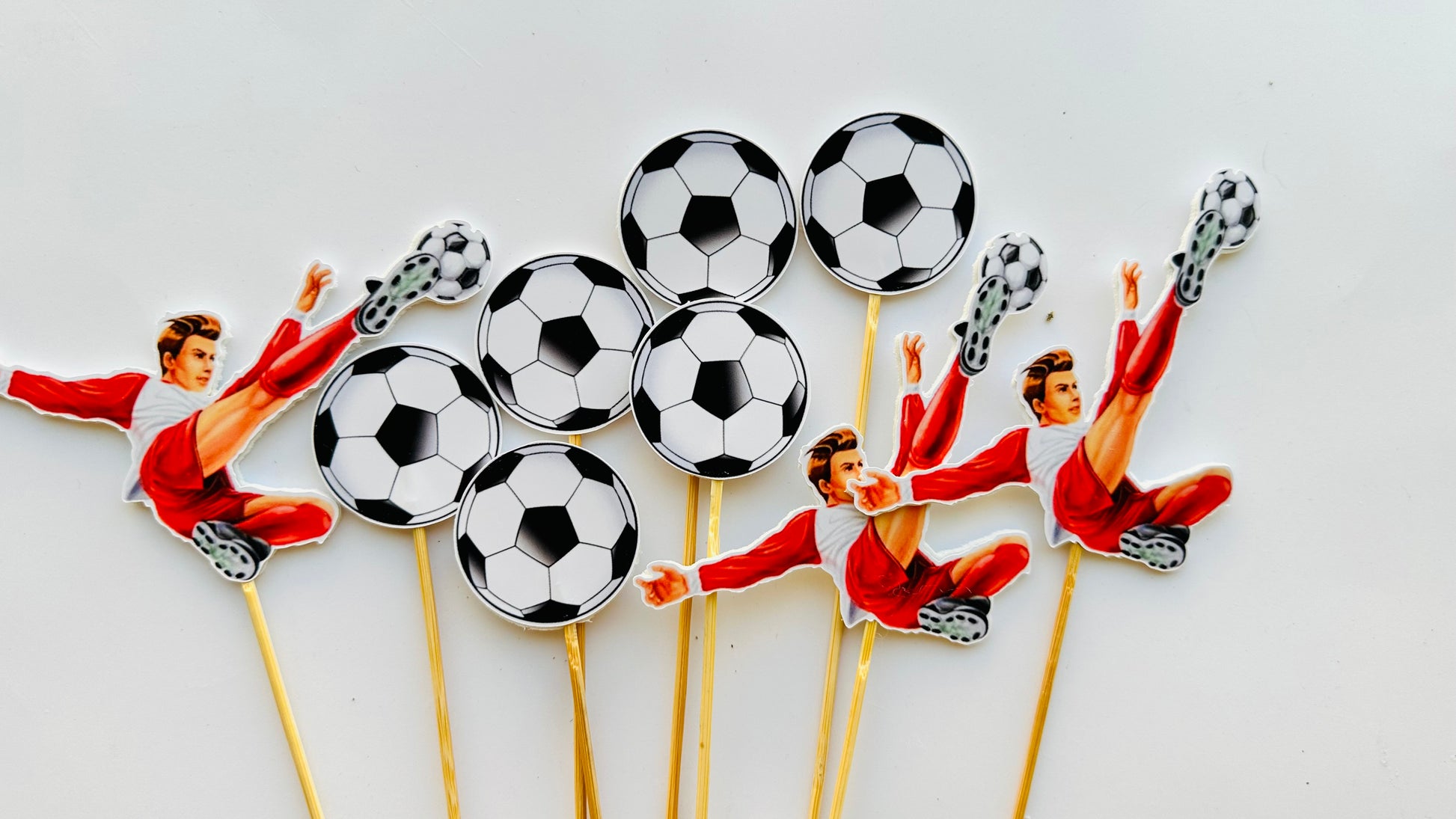 Decorațiune pentru tort cu tematică fotbal, realizată din carton necomestibil. Design modern în nuanțe de roșu, perfect pentru aniversările pasionaților de fotbal. Adaugă un element special tortului și creează o atmosferă de sărbătoare unică.