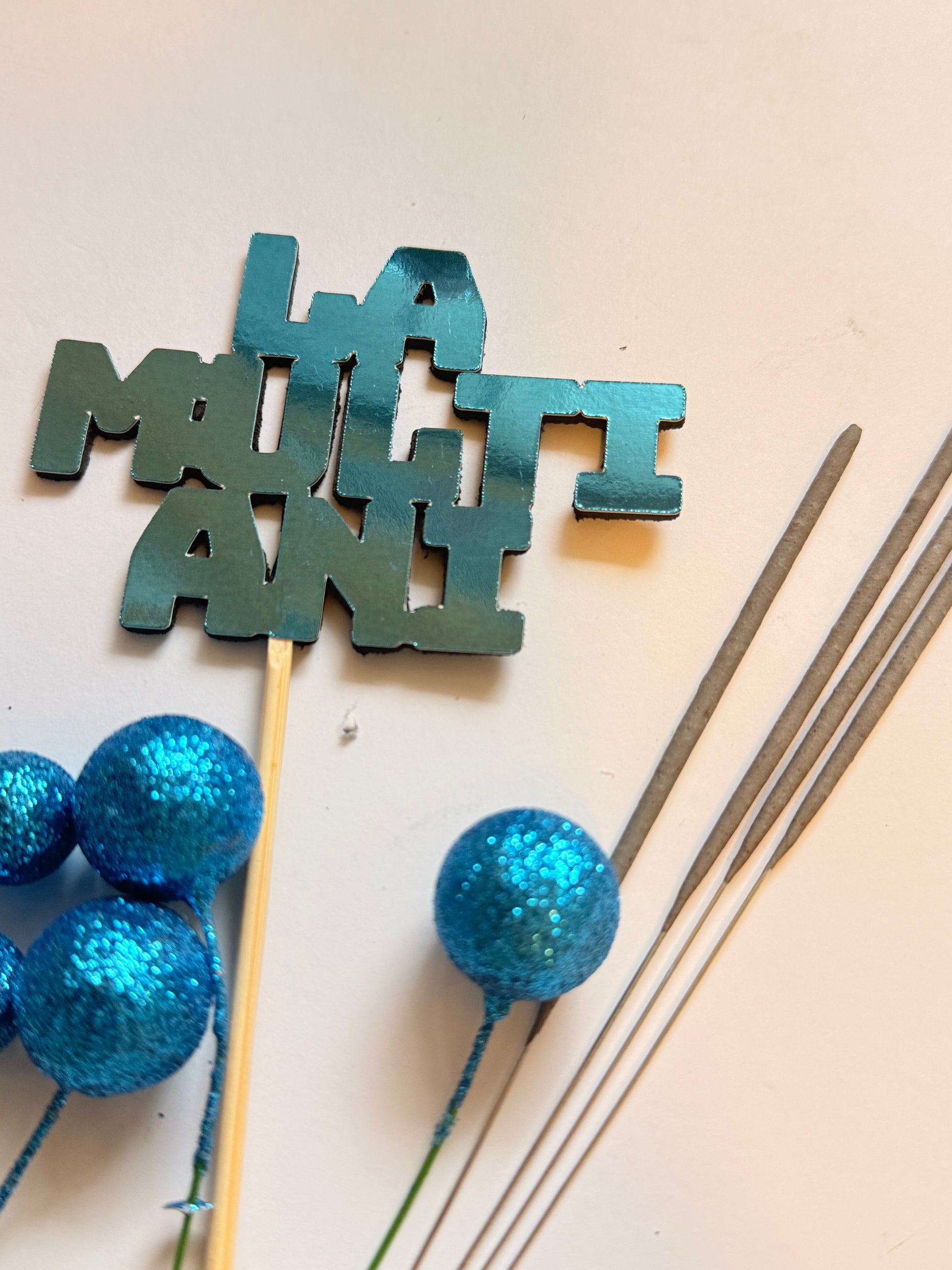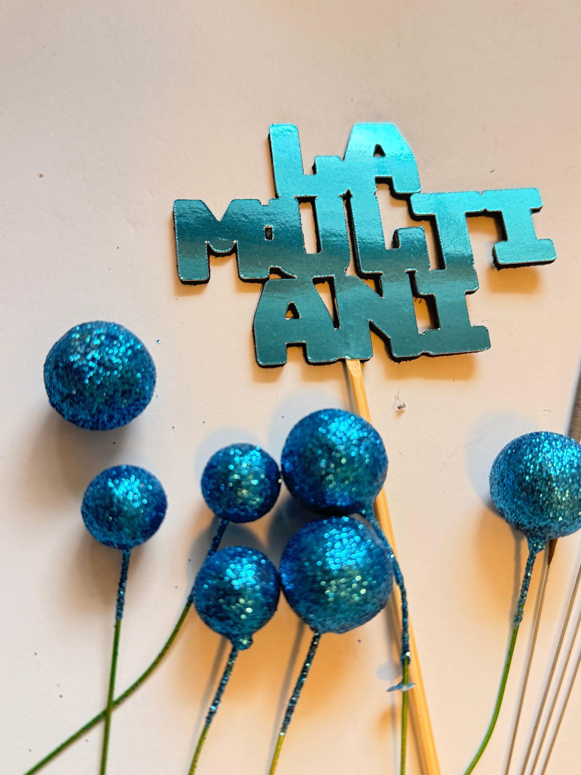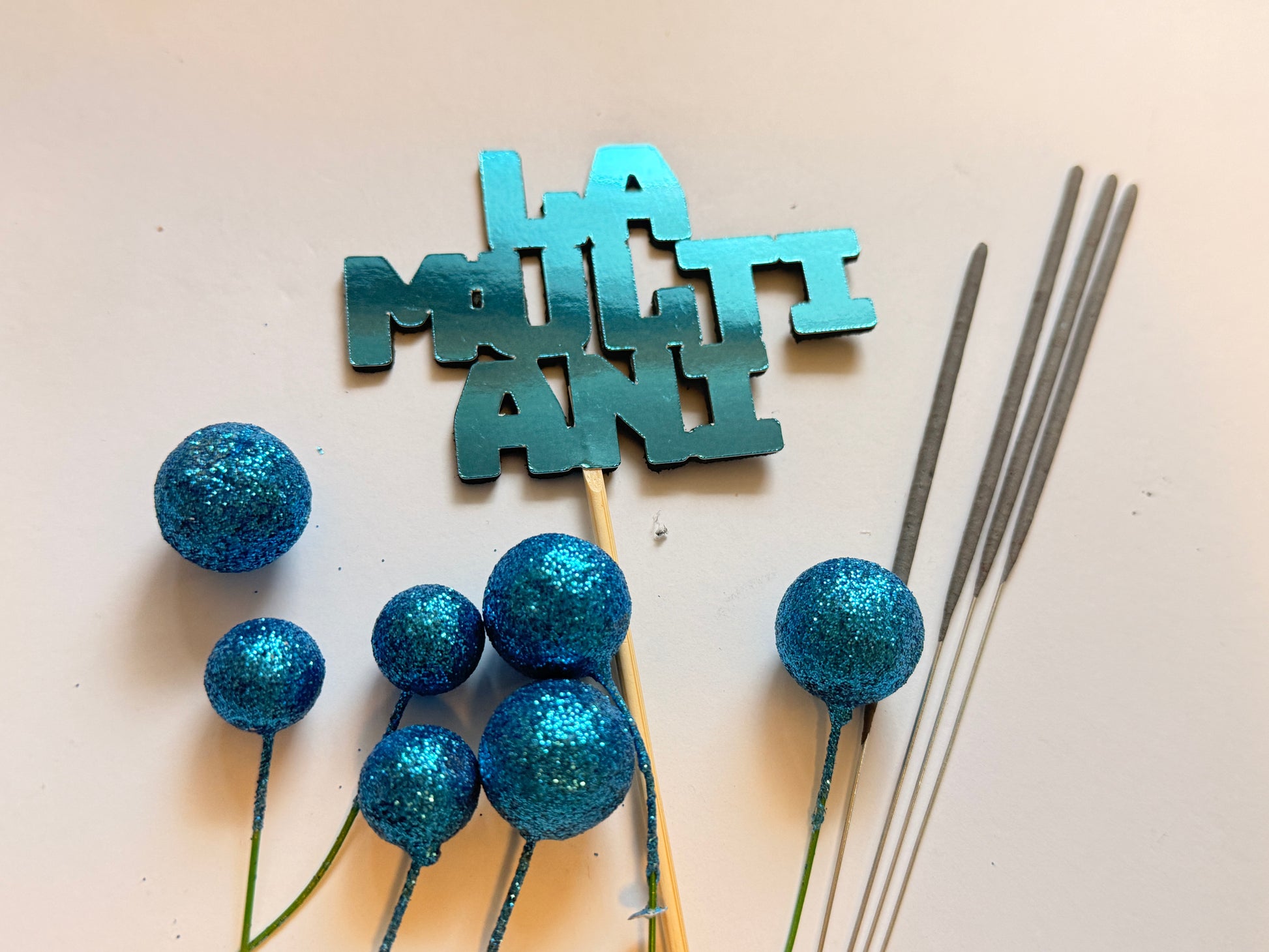 Setul contine un topper carton La multi ani, 4 artificii scanteie rece si 6 bilute polistiren asortate